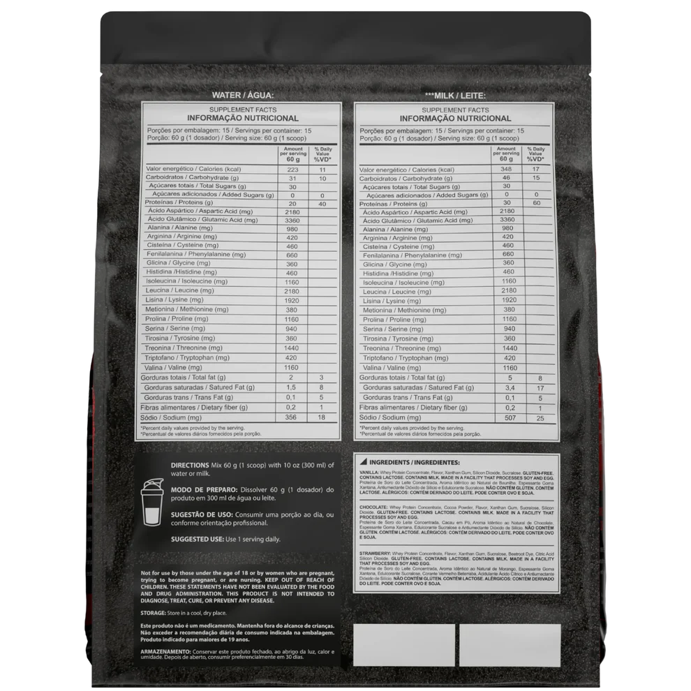 Proteína concentrada do soro do leite (WPC), aroma idêntico ao natural de morango, espessante goma xantana, corante vermelho bordeaux, edulcorante sucralose e antiumectante dióxido de silício. Colorido Artificialmente. NÃO CONTÉM GLÚTEN. CONTÉM LACTOSE.